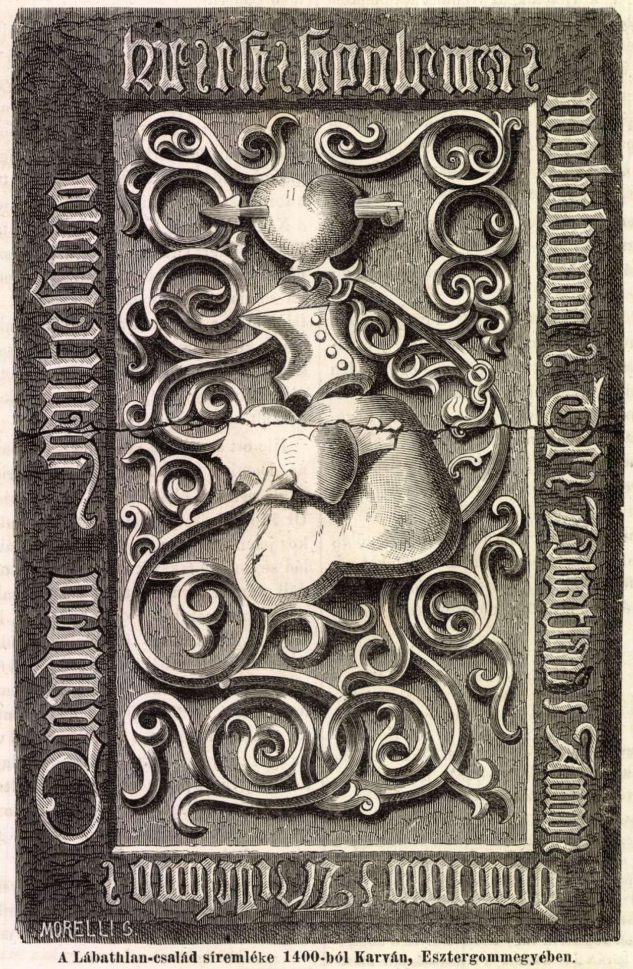 Ezen növény-díszlet stilizatiója oly meglepőn szép, maga a faragvány oly művészi könnyüdedséggel van kivíve, hogy ez emlékkövet méltán tekinthetjük úgy, mint régi síremlékeink egyik legkitünőbbikét. Érdekeltségünk még inkább fokozva lesz, midőn szerkezetéből annak igen nagy régiségére következtethetünk; mivel tudjuk, hogy a tornasisak és a paizsok még Németországban is a XIY—XY-dik században használtattak leginkább, a miért sírkövünket ezen korszakból származottnak kellene tartanunk még azon esetben is, ha semmi felirat nem tanúskodnék erről; de a találgatás, a régészeti alapelveken való számitgatás és korhatározás kételyeitől teljesen felment a sírkőnek igen szépen megmaradott körirata, mely kiválóan szép idomú minuskel betűkkel készült körirat a következő: